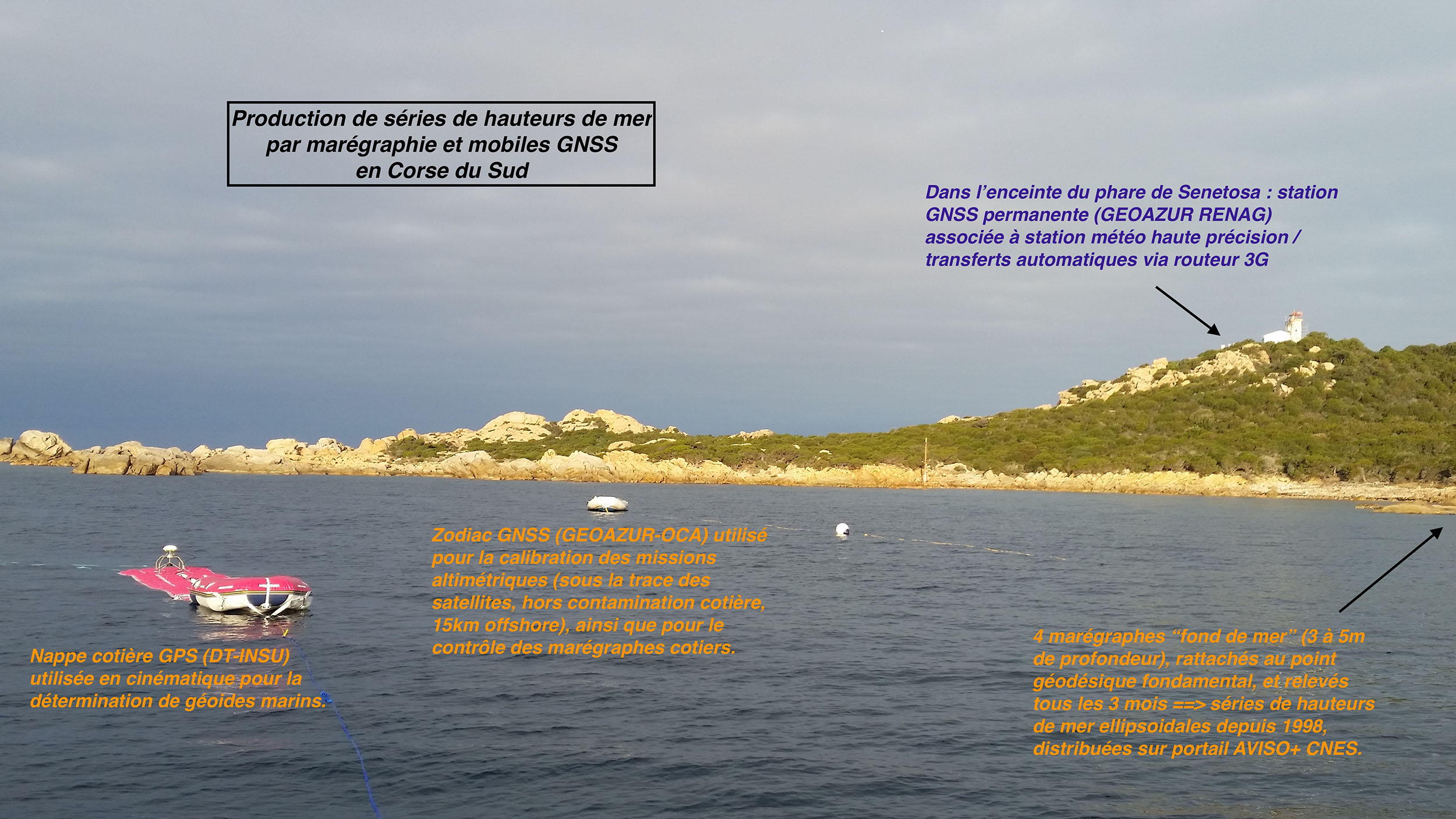 L'équipe a développé un site d'étalonnage absolu des missions d'altimétrie radar en Corse (1998), soutenu par le CNES, et a largement contribué aussi au développement de sites annexes, notamment en Inde, ainsi qu'en Corse (sites secondaires). Ces sites géodésiques, nécessairement côtiers, sont équipés de plusieurs capteurs (GNSS, marégraphes, géoïde marin local et météo) mis en oeuvre en permanence et simultanément dont les données et l'exploitation ont été mis en base de données à Géoazur. Le site de Corse est fondamental pour la NASA, le CNES et EuMETSAT (ESA) dans le cadre des missions Jason, HY-2A, Cryosat-2, Saral, et Sentinel-3A. Il est donc important de continuer à l'exploiter et le ré-adapter en fonction des nouvelles missions.