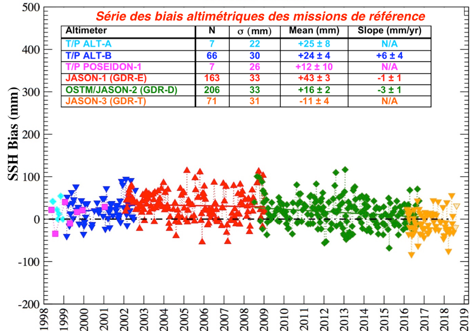 L’équipe ASTROGEO-GPM s’est investie dans l’étude à long terme des biais et dérives de la mesure altimétrique qui nécessite une attention très particulière au niveau de quelques 0.1 mm/an. Les dérives instrumentales peuvent conduire à une variation fictive du niveau de la mer au sein d’une mission. Si la réalisation du repère de référence terrestre sous-jacent est très importante, l’analyse absolue des biais instrumentaux est fondamentale ; le but étant de relier les séries altimétriques de missions altimétriques différentes, ce sur de longues périodes de temps (actuellement plus de 24 ans de mesures continues depuis TOPEX/Poseidon lancé en 1992 jusqu’à Jason-3 lancé en 2016).